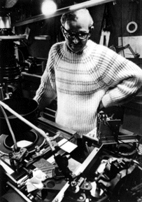 A pioneer in computer animation. He operated one of the first computer-graphics engines. A mechanical analog computer built from surplus World War II anti-craft guidance hardware. The camera shown in the upper left corner aims toward the light of the apparatus and paints the film with light.